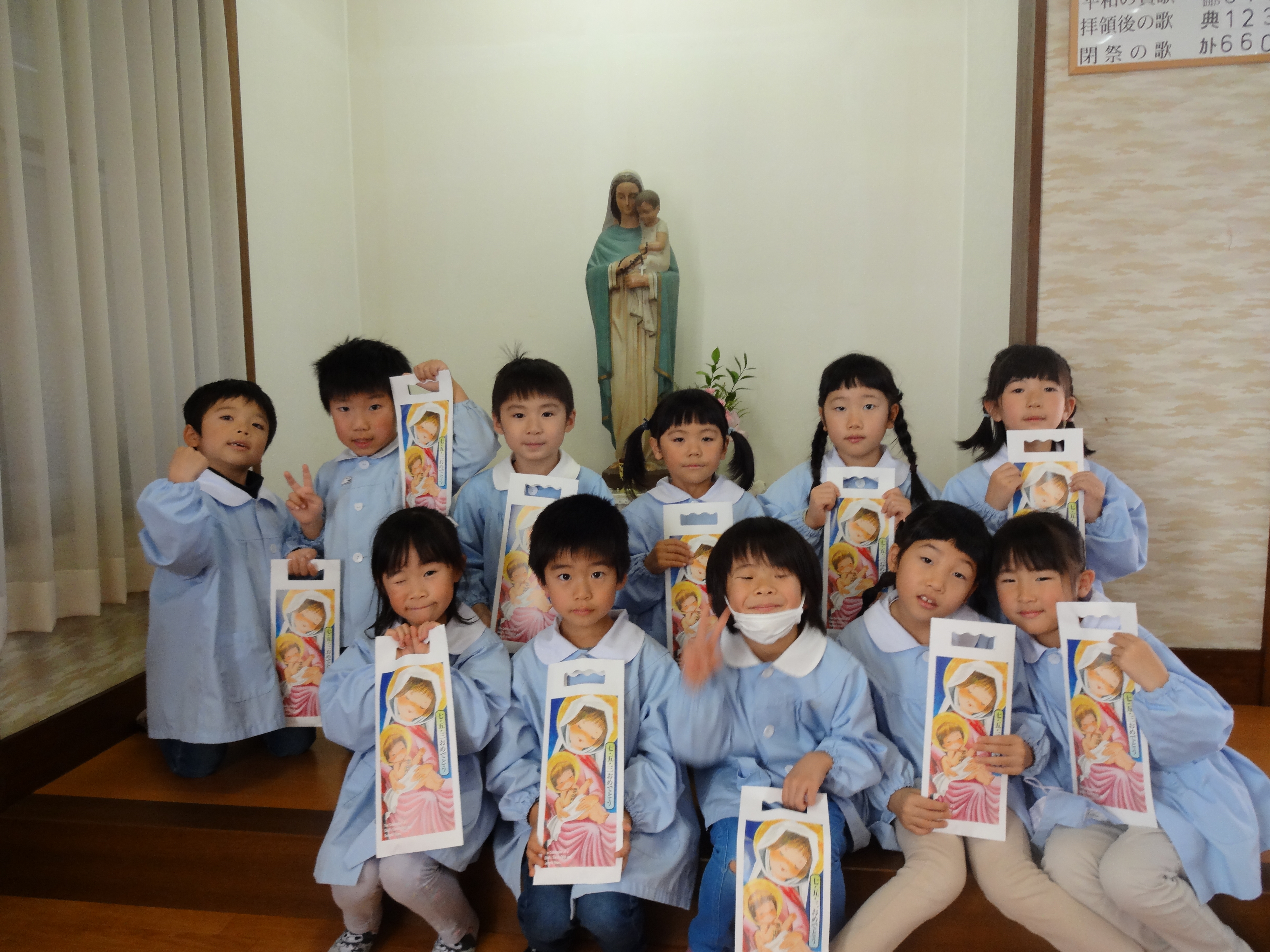 11月15日に、子育て広場のお友だち、にじぐみ、そらぐみ、つきぐみ、ほしぐみのみんなで教会のお御堂に行き、七五三のお祝いをしました。